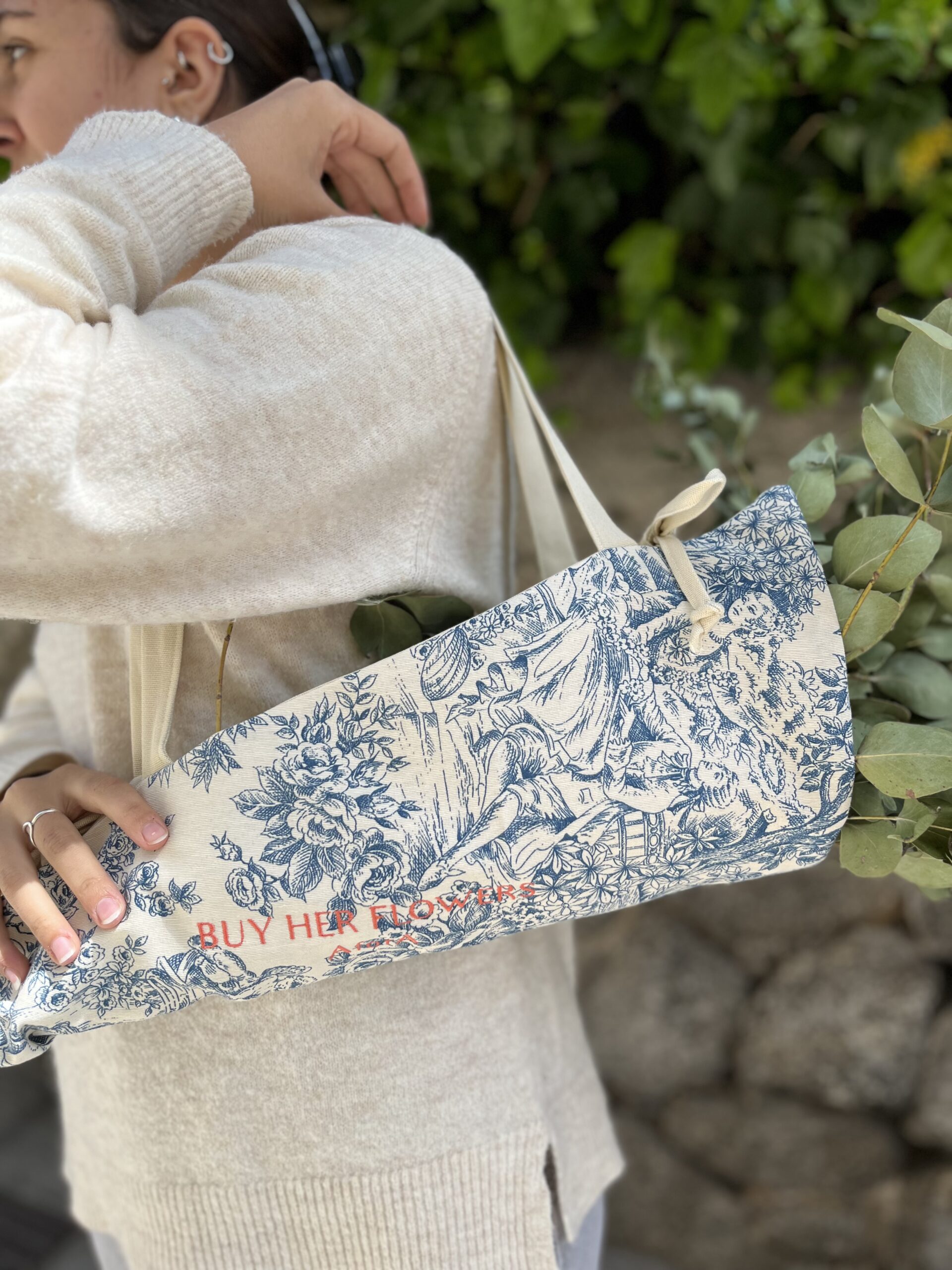 Confeccionado en loneta estampada, combina resistencia y ligereza con una estética que transmite calma y frescura. Su diseño no solo protege el ramo, lo eleva: lo convierte en un regalo aún más especial.