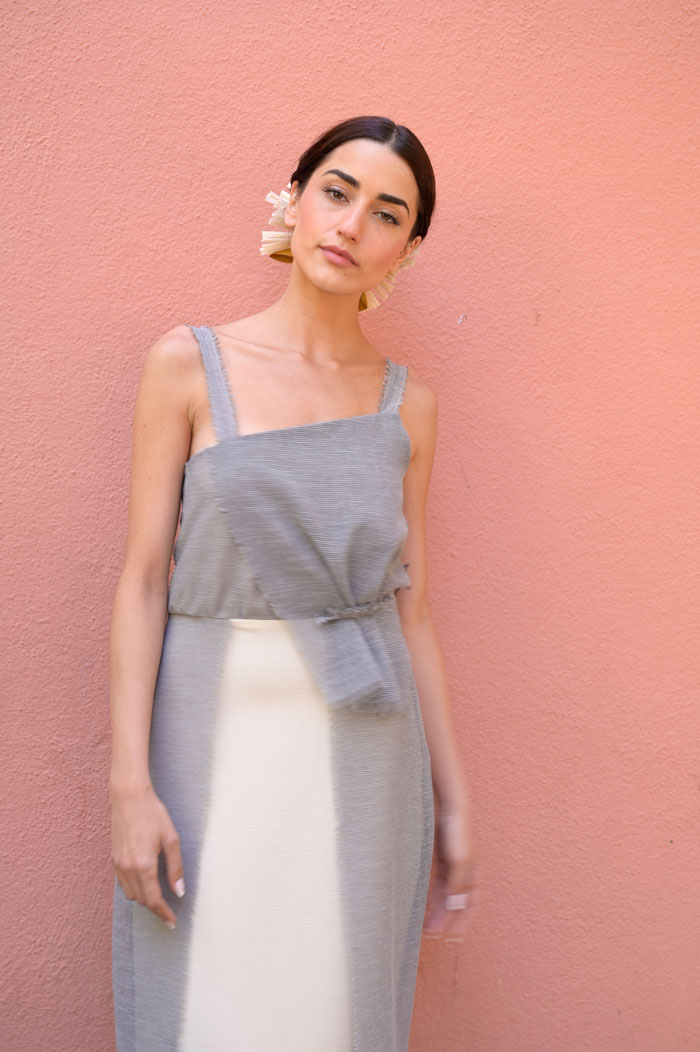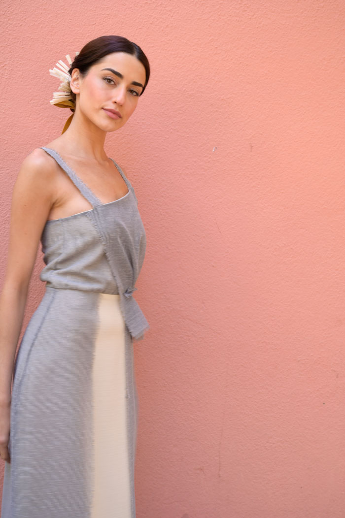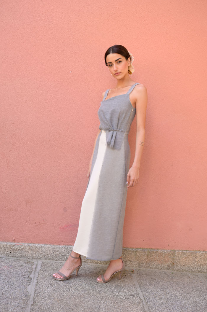 El vestido Como no es nada convencional. Es perfecto si buscas algo fuera de lo común, elegante, con un toque rústico. Está diseñado con un escote cuadrado asimétrico y combina dos tejidos, una arpillera suave en algodón color azul marino y una base en algodón azul claro. Lleva remates desflecados en los tirantes y los centros de la falda. El cuerpo se recoge formando unas tablas en el lateral.